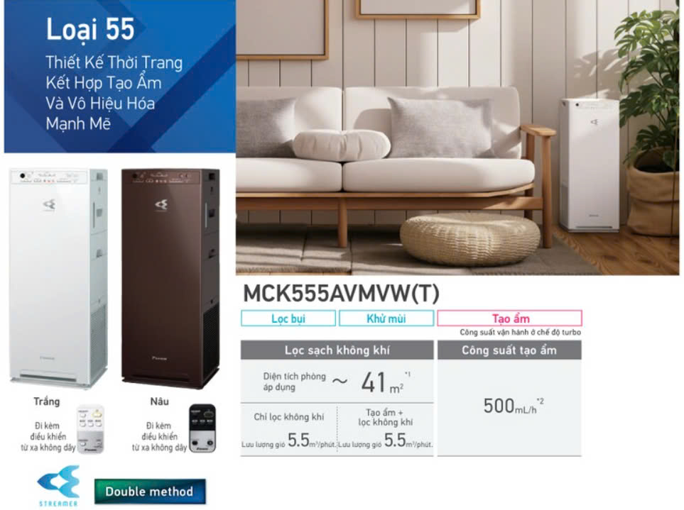 Máy lọc không khí Daikin MCK555AVMVW(T) sử dụng diện tích < 41 mét vuông, có thể tạo ẩm + lọc khí 5.5 m3/ phút công suất vận hành ở chế độ Turbo, đối với tạo ẩm 500ml/h, mang lại hiệu quả cao trong quá trình làm sạch không khí.