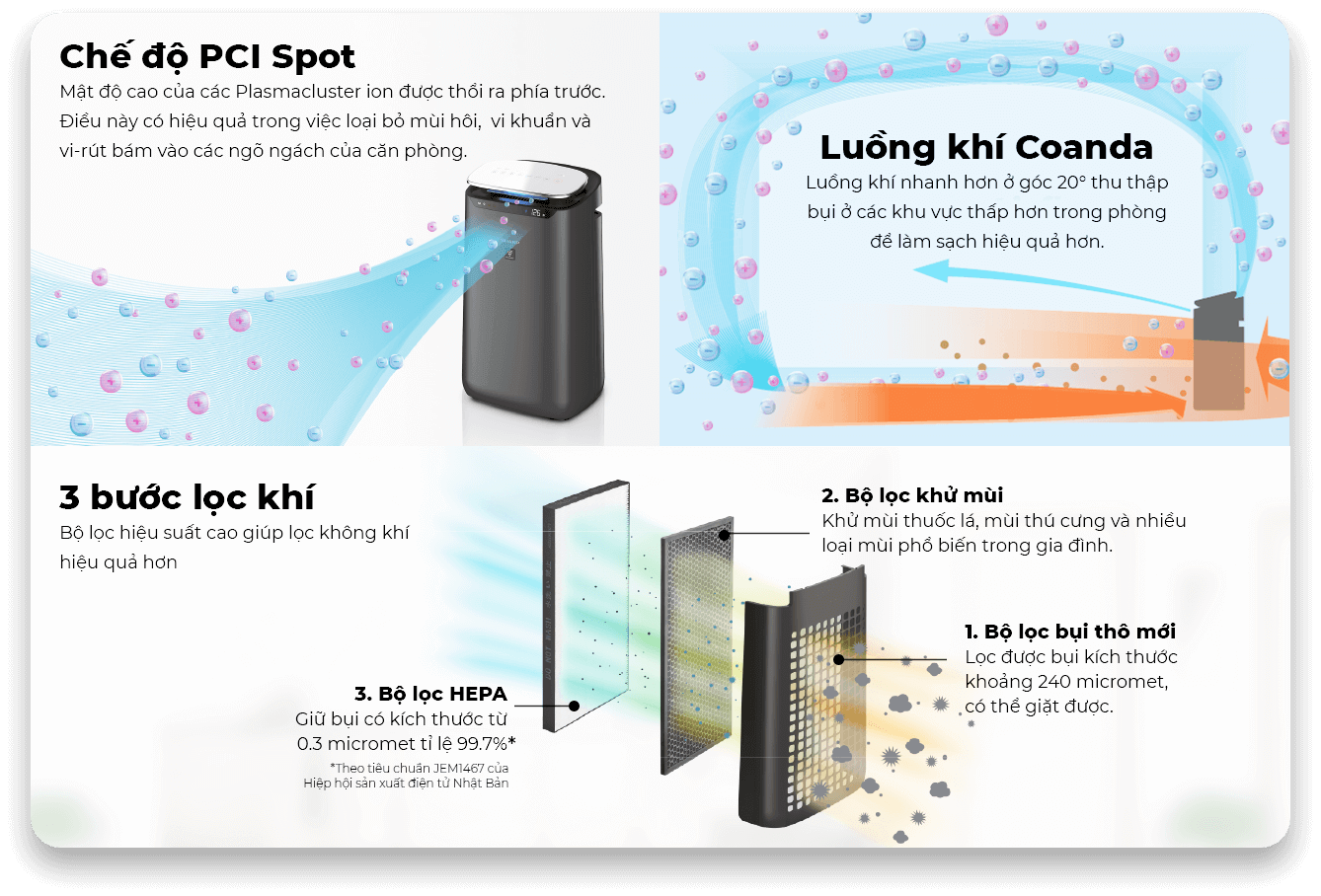 - Mùa hè, không khí khô và nóng làm bụi mịn dễ bay lơ lửng hơn, đặc biệt là ở thành phố. Máy lọc giúp loại bỏ bụi PM2.5, phấn hoa, lông thú cưng, giảm bụi mịn và ô nhiễm không khí