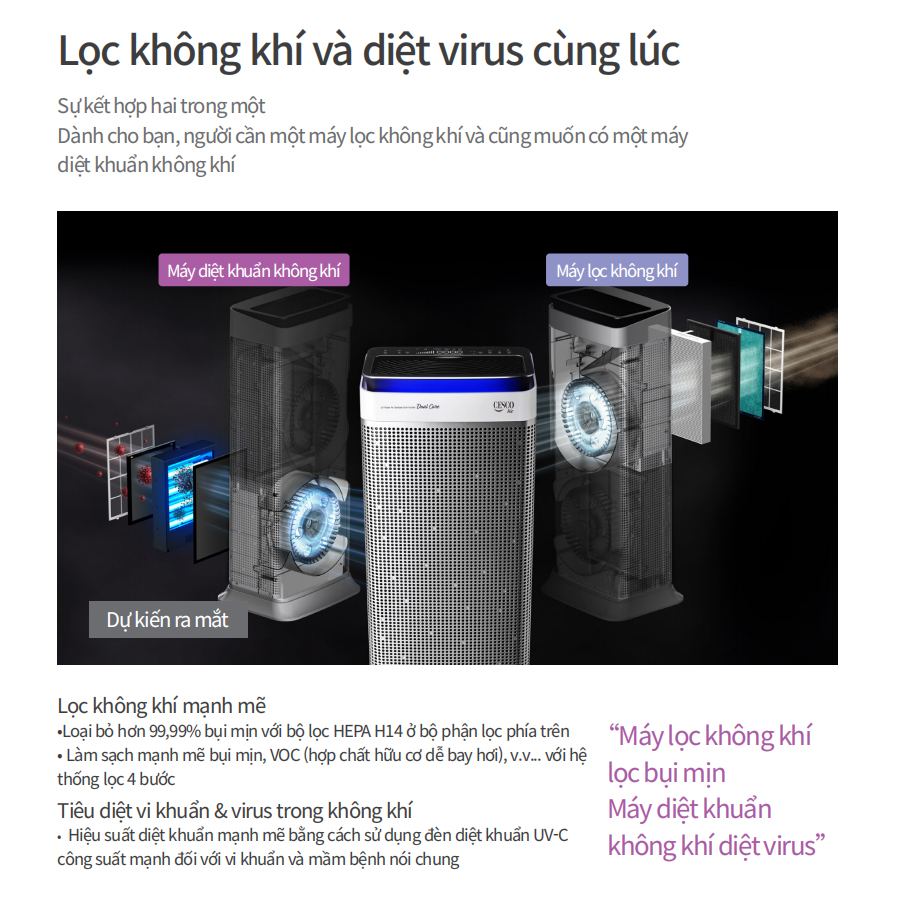 Công nghệ kép độc quyền: Kết hợp hệ thống lọc không khí tiên tiến với công nghệ diệt khuẩn bằng tia UV-C, giúp loại bỏ hiệu quả bụi mịn, vi khuẩn và virus trong không khí