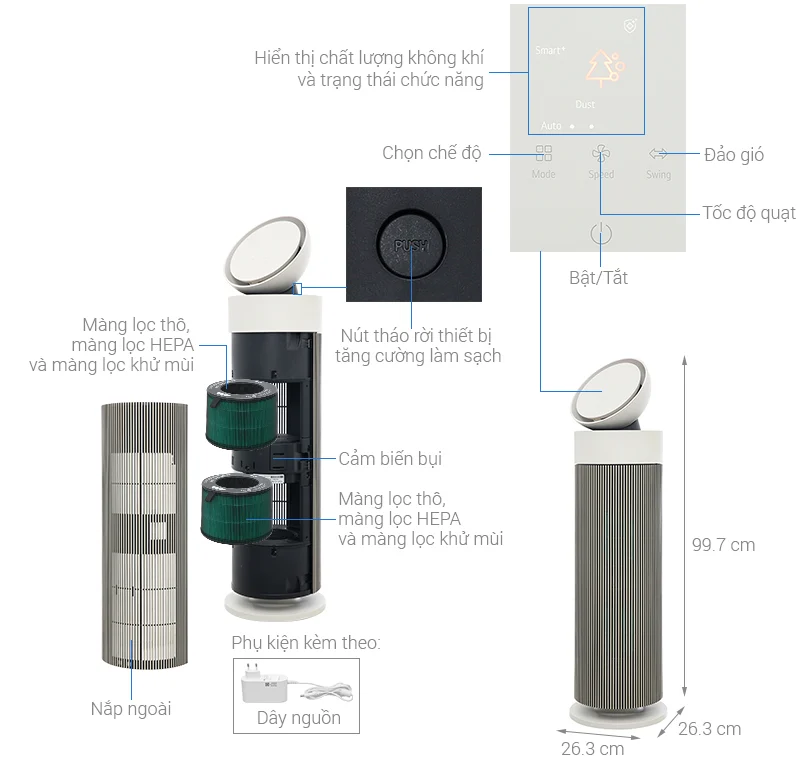 - Công nghệ Aero Booster: Tạo luồng khí mạnh mẽ, đẩy không khí sạch xa hơn và phân tán đều khắp phòng.