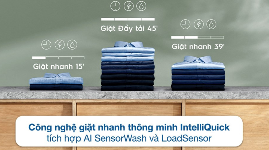 2. Công nghệ giặt nhanh thông minh IntelliQuick tích hợp 2 cảm biến AI SensorWash, LoadSensor.