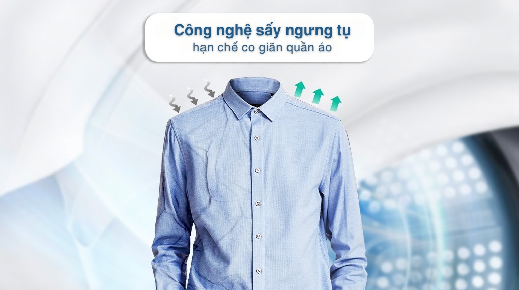 • Công nghệ sấy ngưng tụ nên người dùng không cần lắp đặt ống thoát khí, có thể dễ dàng đặt máy ở bất kỳ đâu mà vẫn đảm bảo an toàn. Công nghệ sấy này giúp hạn chế quần áo co giãn, nhăn sau khi sấy, từ đó người dùng tiết kiệm được thời gian hơn trong việc ủi quần áo.