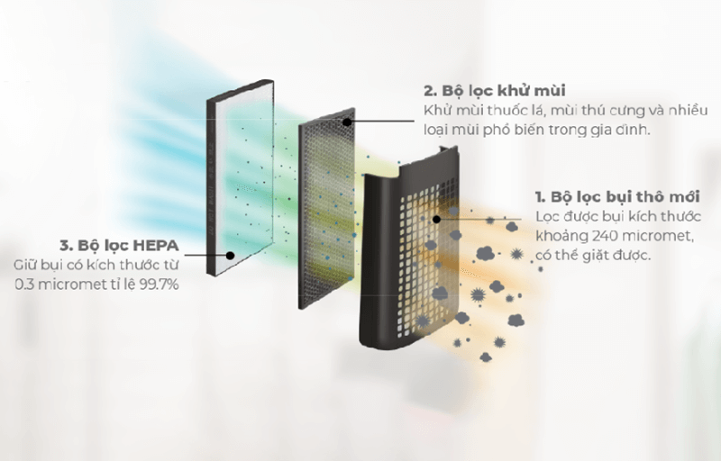 • Màng lọc HEPA: Loại bỏ các chất gây dị ứng, vi rút và vi khuẩn có kích thước nhỏ, hạt bụi mịn PM 2.5, phấn hoa…