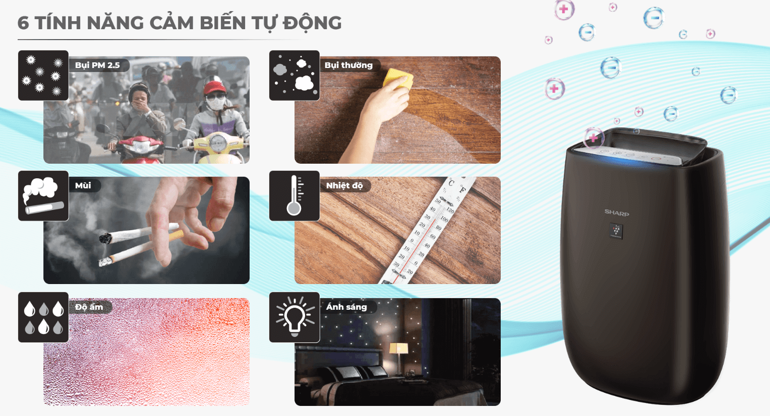Máy lọc không khí Sharp FP-J50V-H được tích hợp bởi 6 cảm biến chính, giúp cho máy lọc không khí chủ động làm sạch không khí