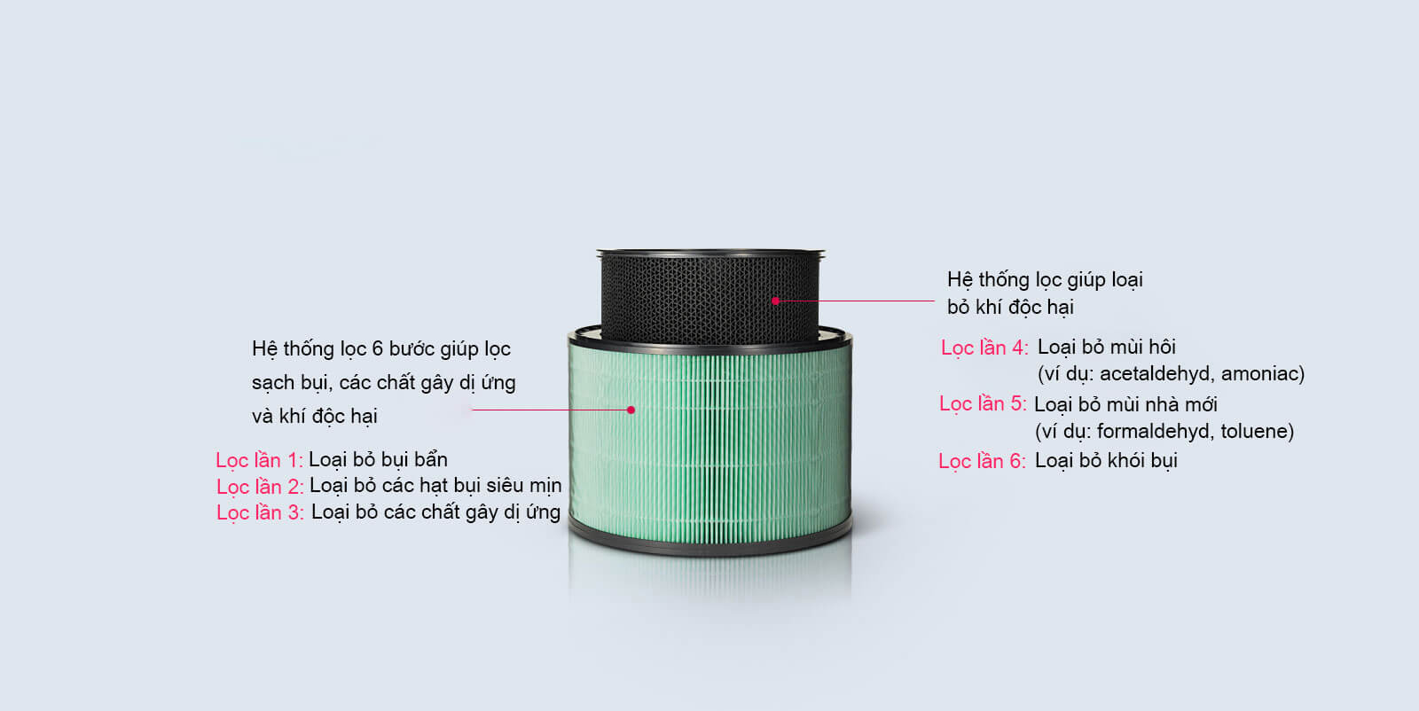Hệ thống lọc 6 bước, máy lọc không khí giúp loại bỏ các hạt bụi mịn siêu nhỏ và 5 loại khí độc hại gây ra (Amononia, Formaldehyd, Acetaldehyd, Axit axetic và Toluene) được chứng nhận bởi Hiệp hội làm sạch không khí Hàn Quốc năm 2016